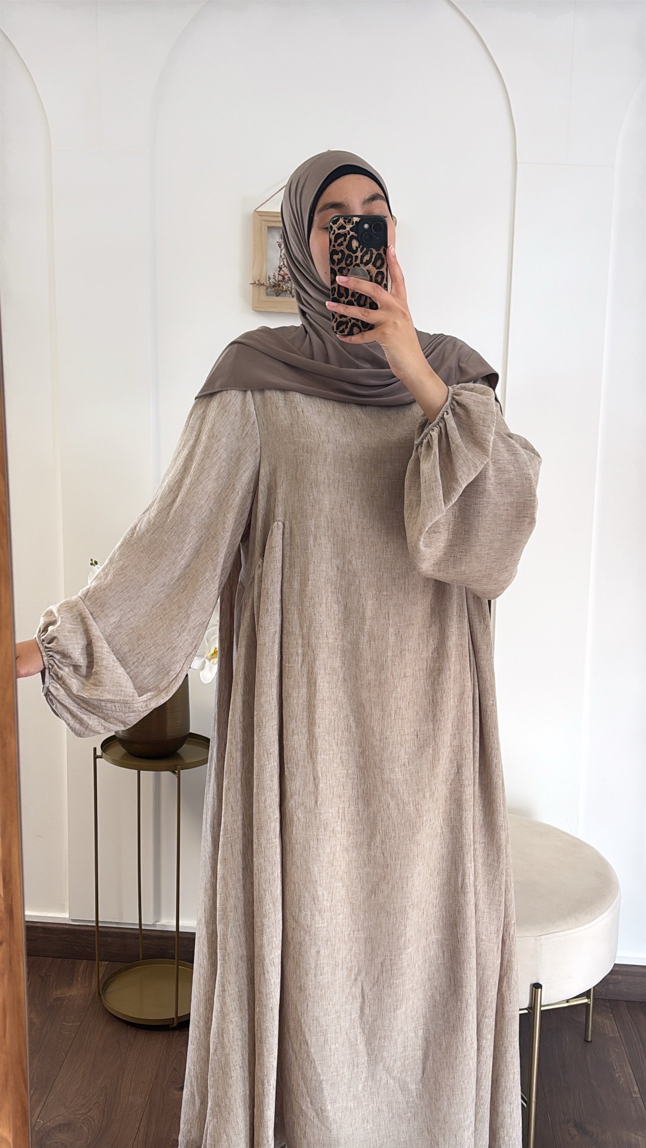Abaya tissu effet lin super évasée avec manche bien longue et ballon
