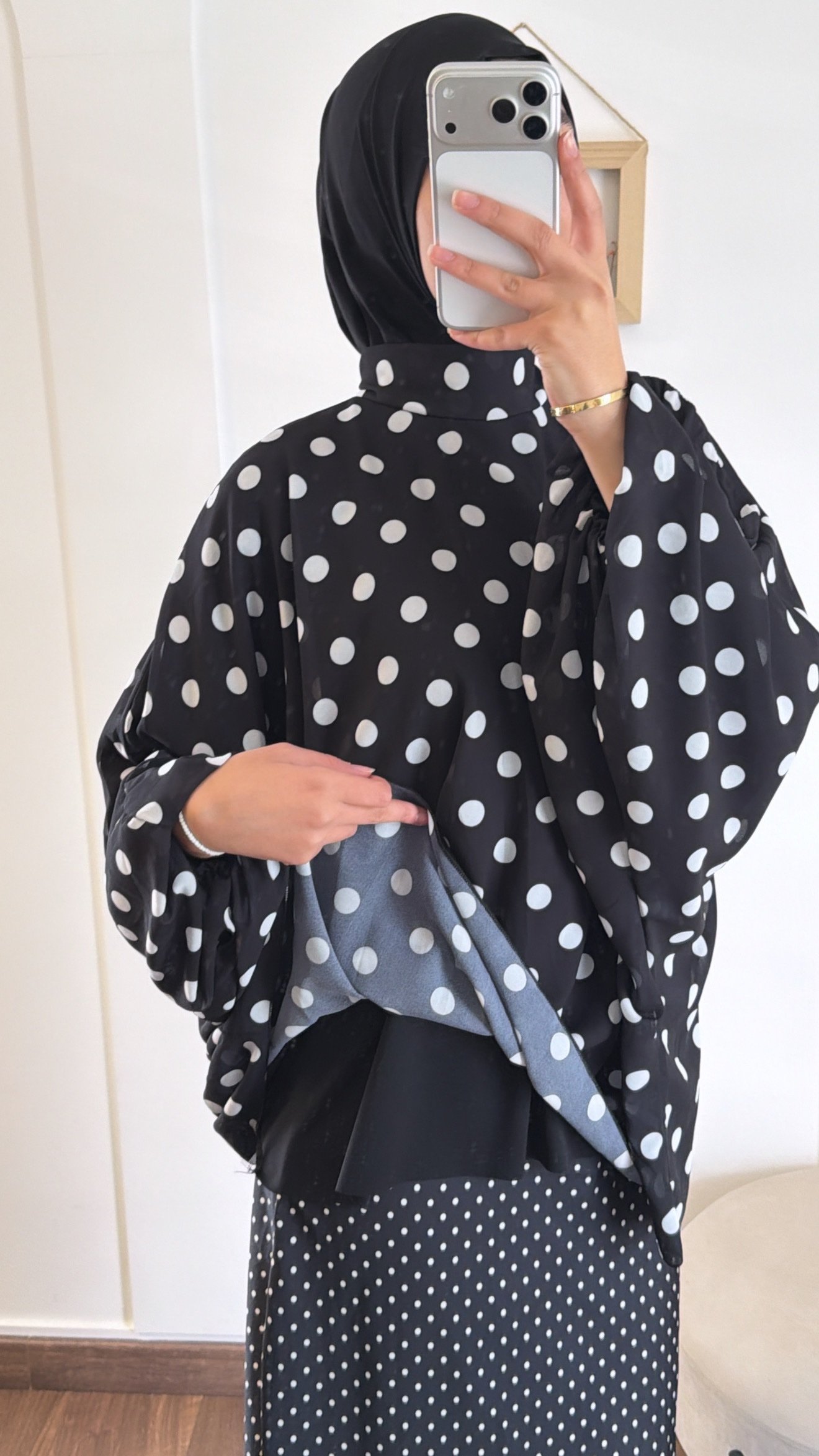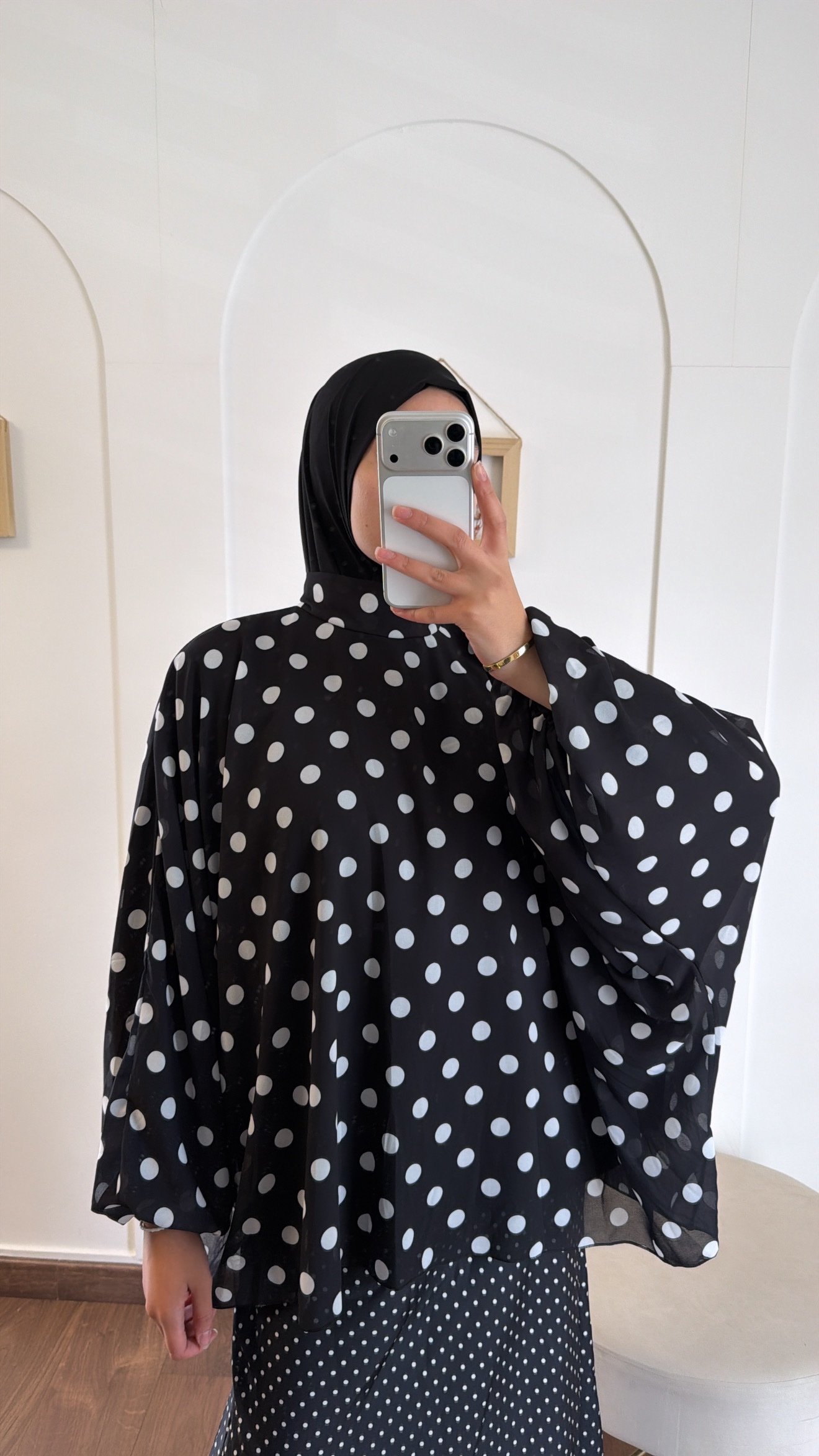 Une blouse fluide et légère en double voile, avec un effet superposé élégant. Son imprimé pois intemporel apporte une touche chic et féminine, tandis que sa coupe ample assure un confort absolu. Parfaite pour un look modeste, moderne et facile à porter au quotidien.