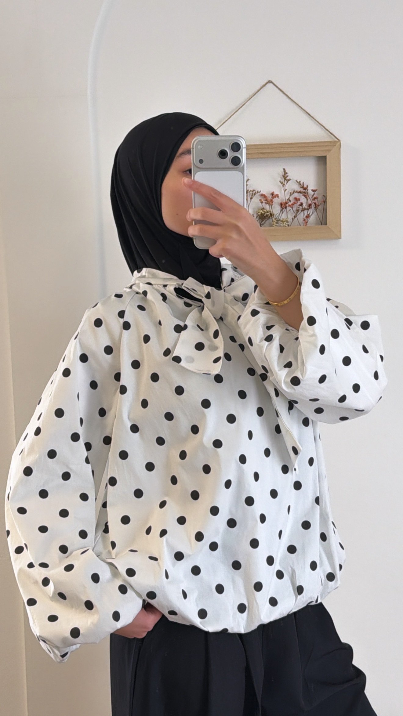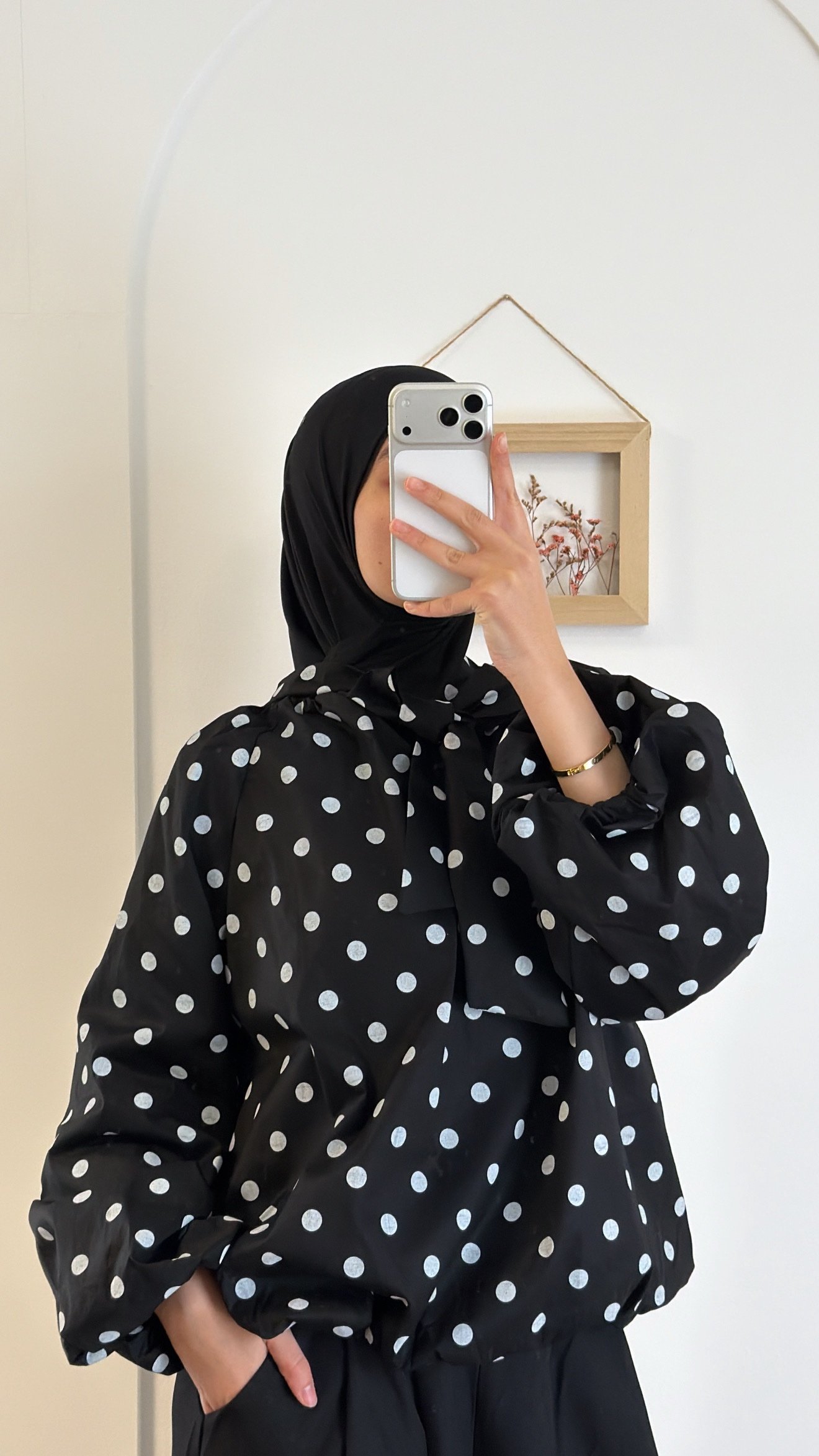 Blouse à pois fluide, doublée pour plus de confort et d’opacité. Manches bouffantes et col noué. Coupe ample, facile à porter au quotidien comme pour une tenue habillée. Disponible en noir et blanc.