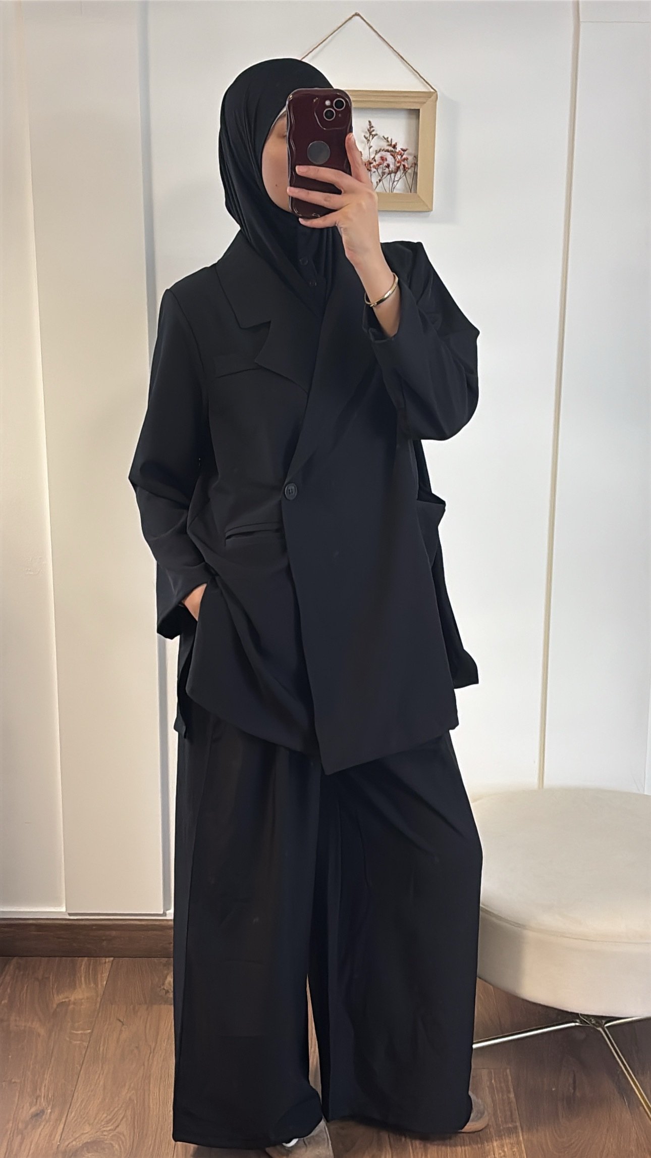 Ensemble blazer et pantalon large, coupe fluide et élégante. Matière légère et confortable, facile à porter au quotidien comme pour une tenue plus habillée. Un ensemble chic et intemporel.