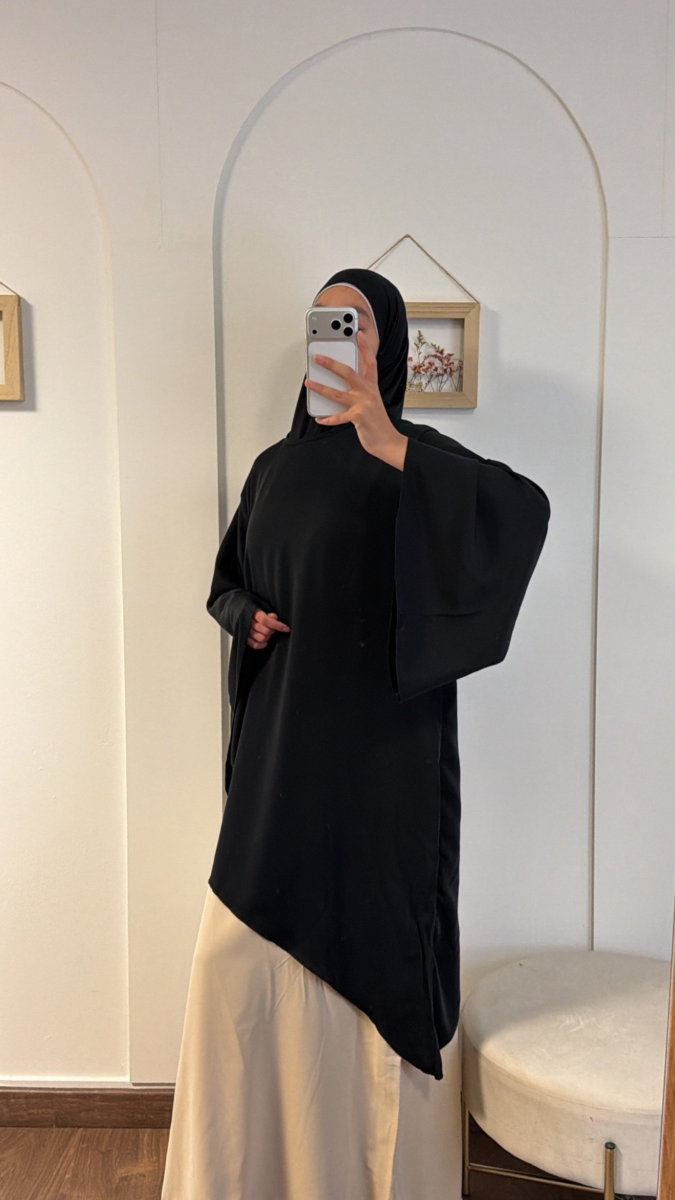 Il se compose d’une sous-abaya fluide et d’un haut ample en soie de Médine, avec des manches larges et une coupe asymétrique pour un joli tombé.