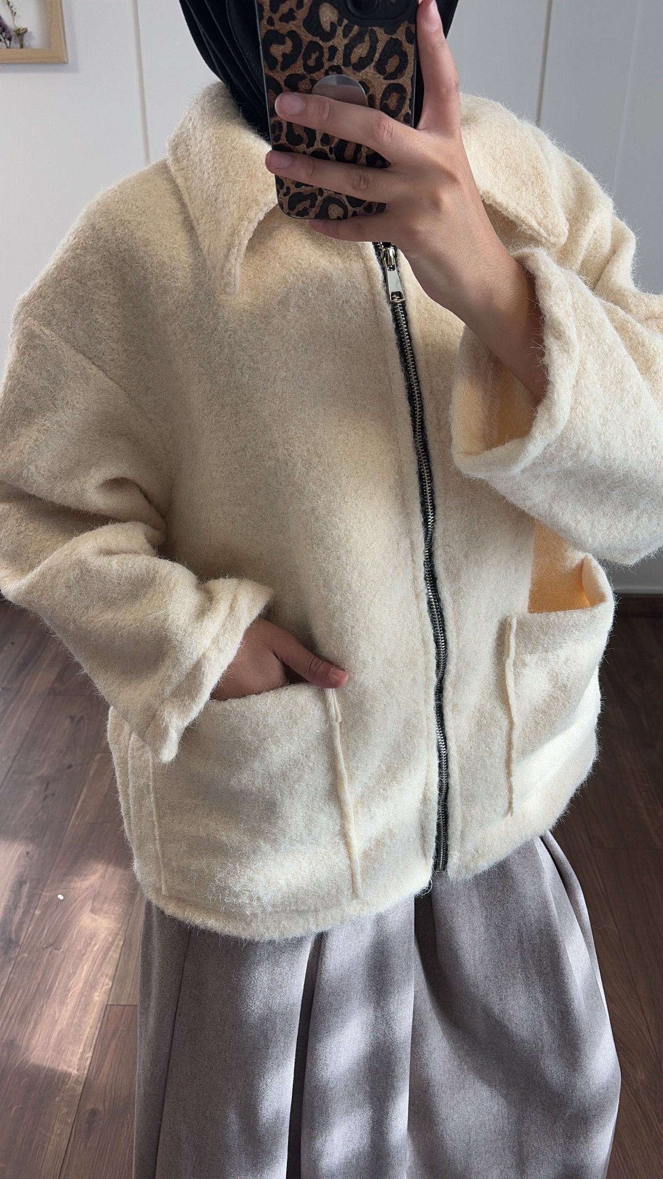 Manteau col court à tissu effet bouclette avec 2 poche et à zip.